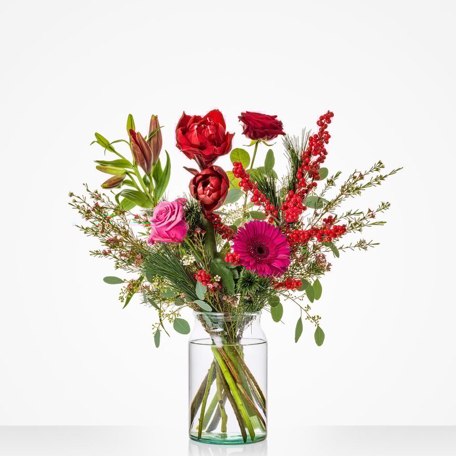 Een mooi rood roze getint pluk boeket in kerstsfeer.